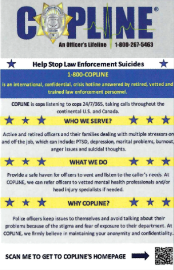 CopLine's® goal is to spread the word that help and support is only a phone call away. We would like to provide FLYERS, Information Cards and PTSD cards to all entities in the Law Enforcement community.